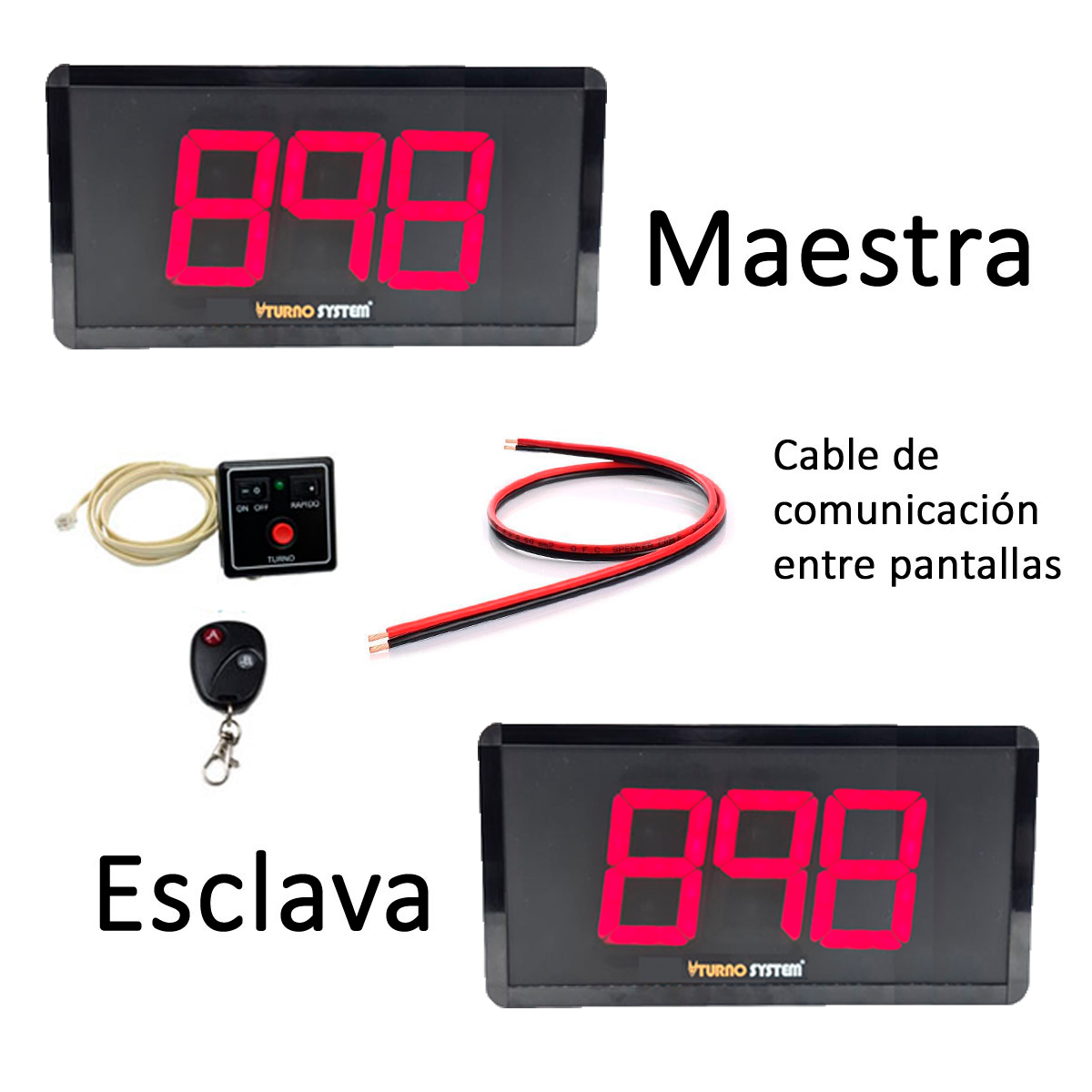 En los comercios es habitual que se necesiten 2 pantallas de turno que muestren el mismo número, una cercana al punto de atención y la otra en un punto en el cual no hay visibilidad de la master. Este tipo de pantallas se denominan maestra/esclava ya que la maestra es la que le dice a la esclava el número que debe mostrar. Es decir, una pantalla de 2, 3 dígitos o Alfanumérica que dirige a la otra.